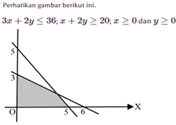 Daerah himpunan penyelesaian (daerah arsiran) dari pertidaksamaan linear adalah … |