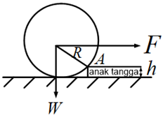 Bila jari-jari = R, berat roda = W, tinggi anak tangga = h, maka gaya F minimum yang dibutuhkan agar roda tersebut dapat naik adalah … |