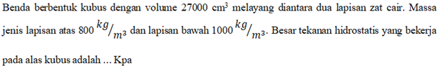Sepotong kaca di udara memiliki berat 25 N. Jika dimasukkan ke dalam air beratnya menjadi 15 N. Bila massa jenis air |