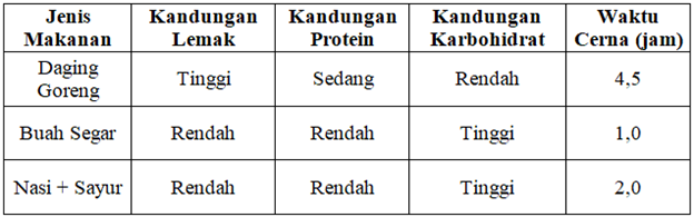 Berikut data kandungan energi dan waktu cerna rata-rata tiga jenis makanan: